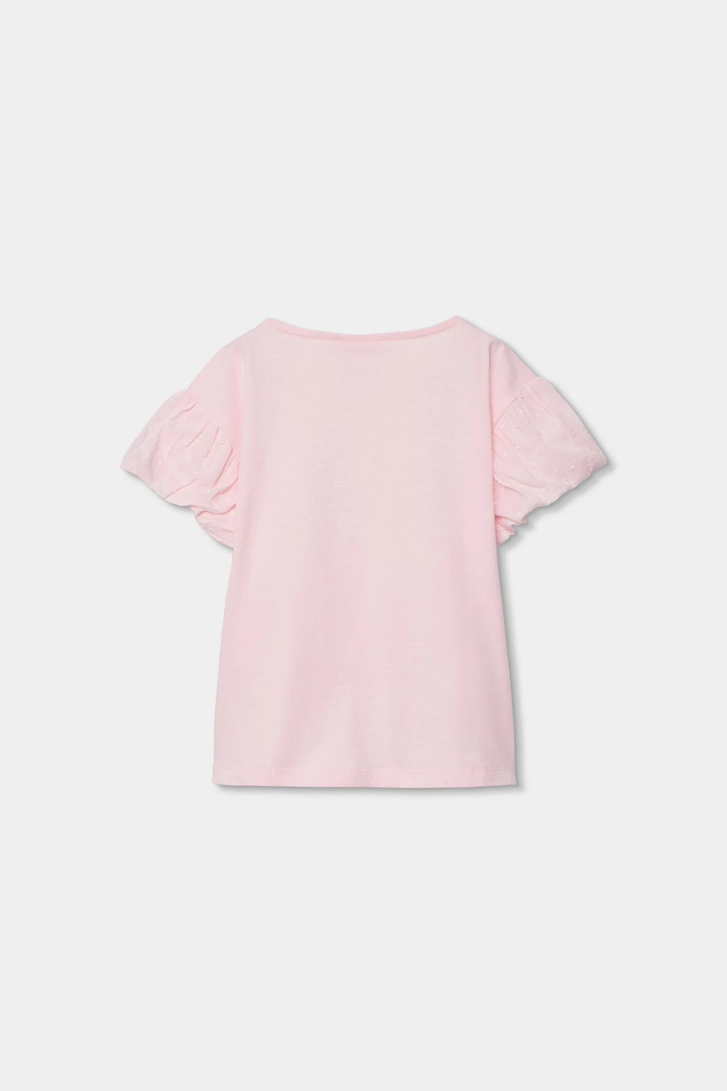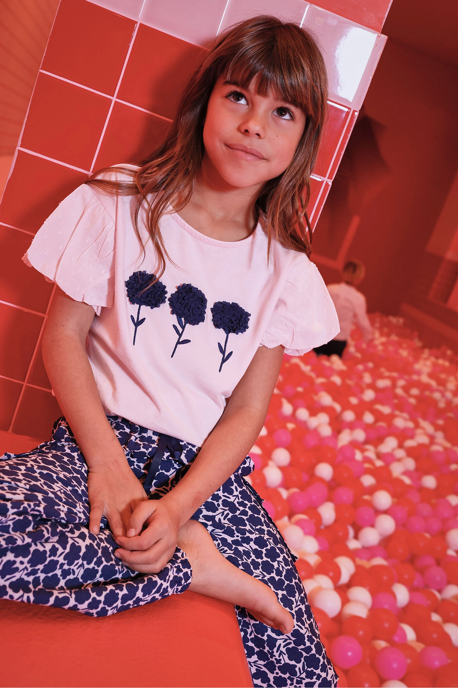 Pink knitted T-shirt for girls, ideal for adding a sweet touch to her wardrobe. The knitted fabric offers comfort and flexibility, making it perfect for everyday wear. It features a floral print design, adding a charming detail. It has short sleeves with a special finish that gives it a unique touch. Available in sizes from 12 months to 10 years. It can easily be paired with jeans or skirts to create a versatile and delightful style.
