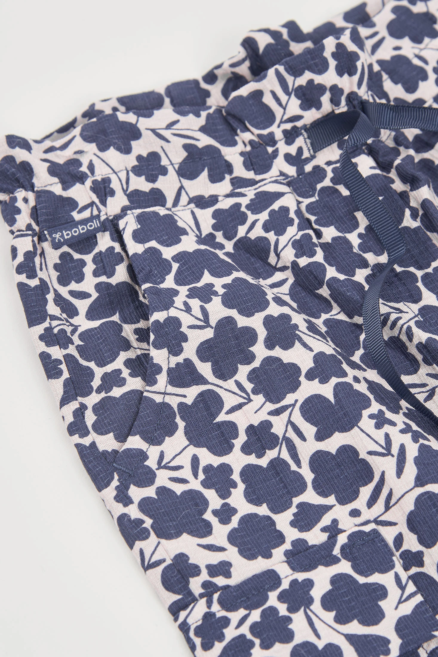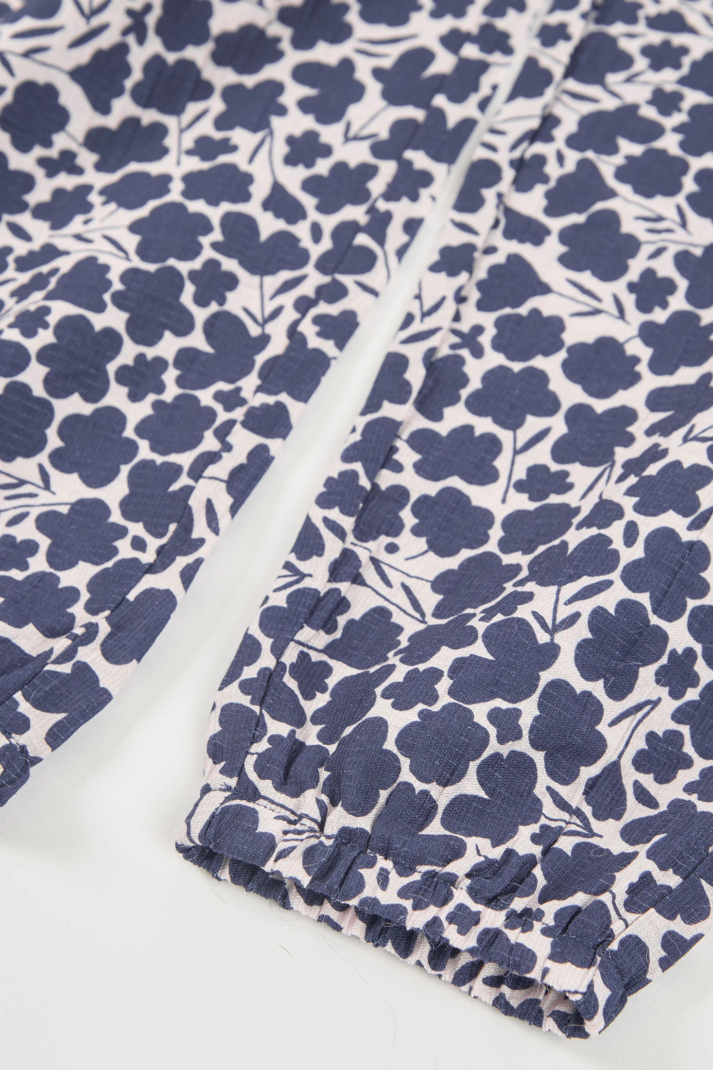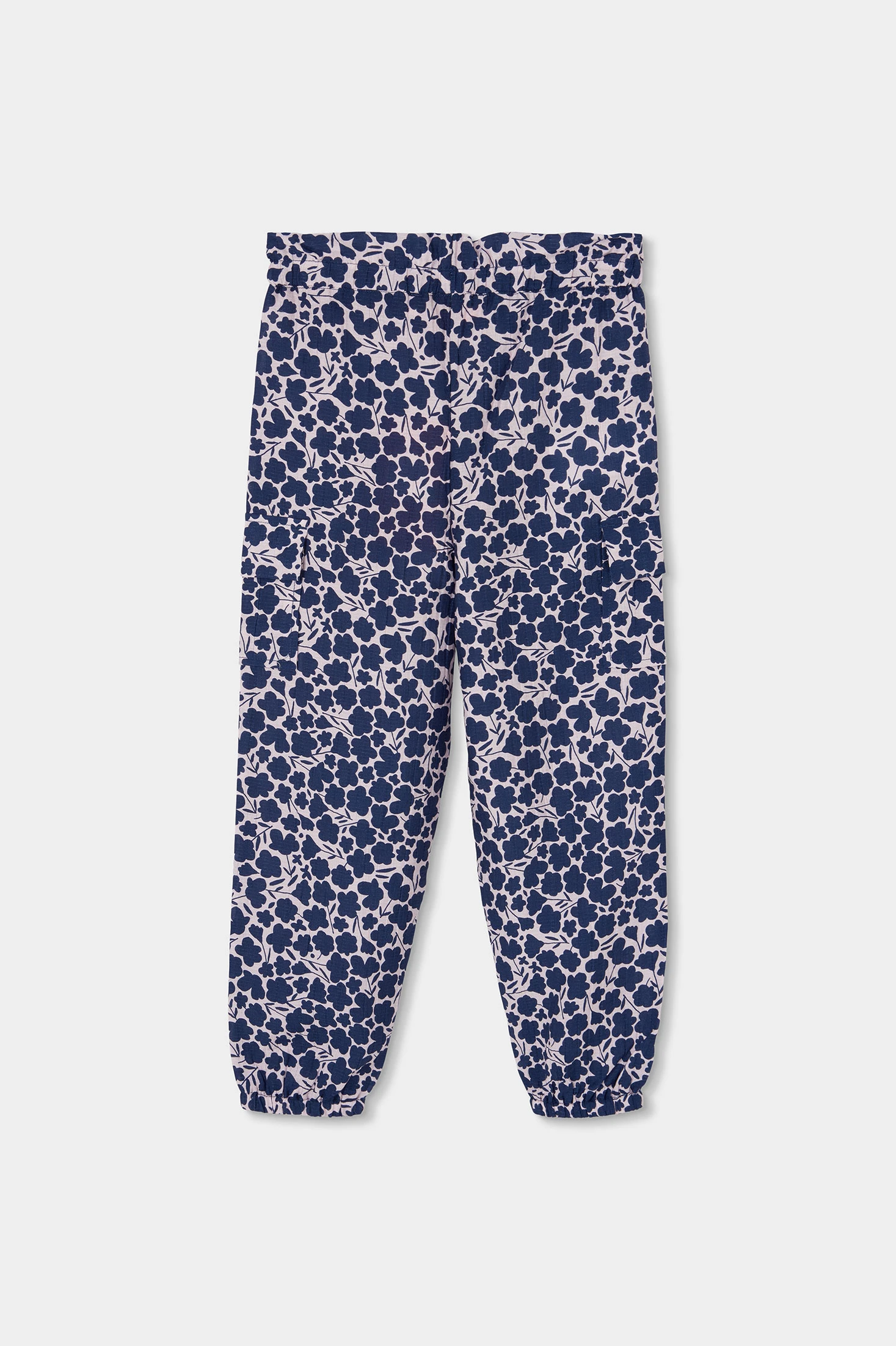 Floral print trousers for girls, a charming and functional garment. Its floral design in blue tones makes it perfect for adding a touch of nature to the wardrobe. Made from a soft material, it offers comfort for everyday wear. Available in sizes from 12 months to 10 years, it adapts to the child?s growth. The adjustable waistband with a bow enhances its practicality. Pair it with a plain T-shirt for a balanced and versatile look. Ideal for any season, it?s a stylish and comfortable choice for the little ones.