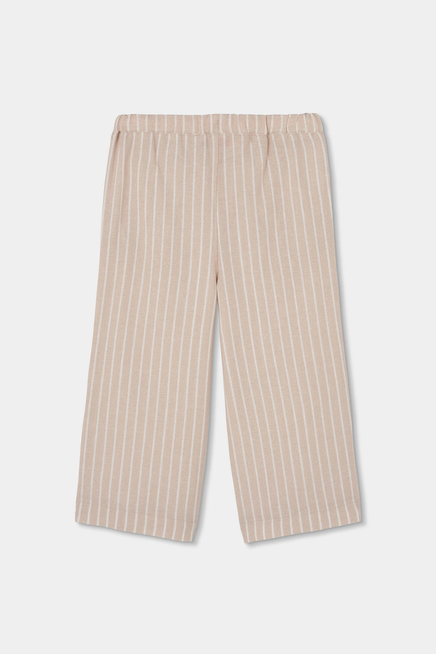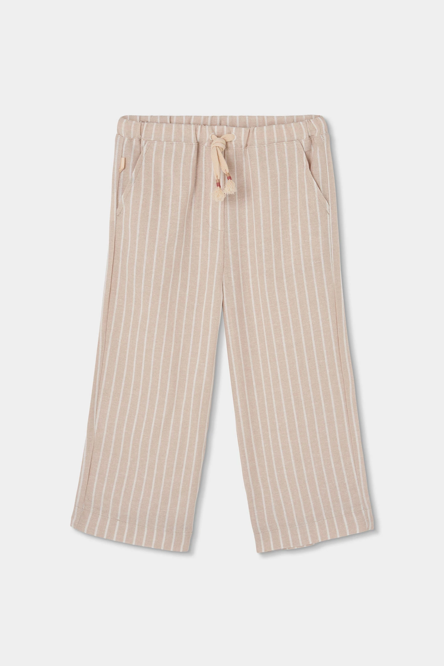 Striped linen trousers for girls, ideal for warm climates thanks to their breathable and lightweight material. They feature a beige design with fine vertical stripes, giving them an elegant and fresh touch. The elastic waistband with adjustable drawstring ensures comfort and a good fit. Available in sizes from 12 months to 10 years, it is a versatile garment that allows freedom of movement. Its side pockets add functionality, and its neutral style makes it easy to pair with blouses and t-shirts for a casual and chic look.