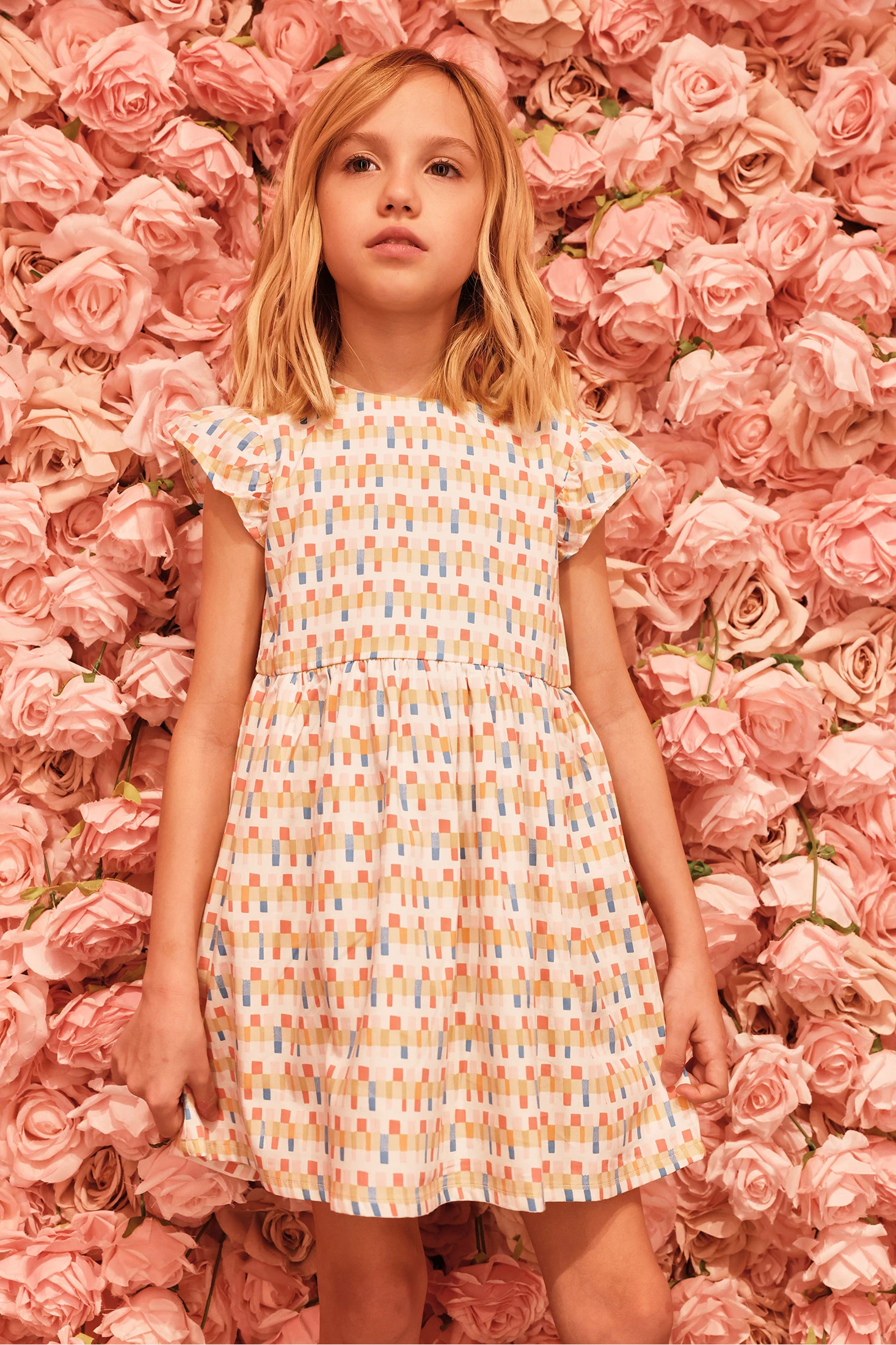 Printed satin dress with borders, perfect for growing girls, offers a delicate and elegant style. Its design features a pastel colour pattern, creating a charming visual effect. Made from satin, it ensures softness and comfort, perfect for special occasions. Sizes are available from 12 months to 10 years, ensuring a suitable fit for different ages. With short sleeves and a slight flare in the skirt, the dress offers a fresh and cheerful look. Ideal for pairing with simple accessories at any event.