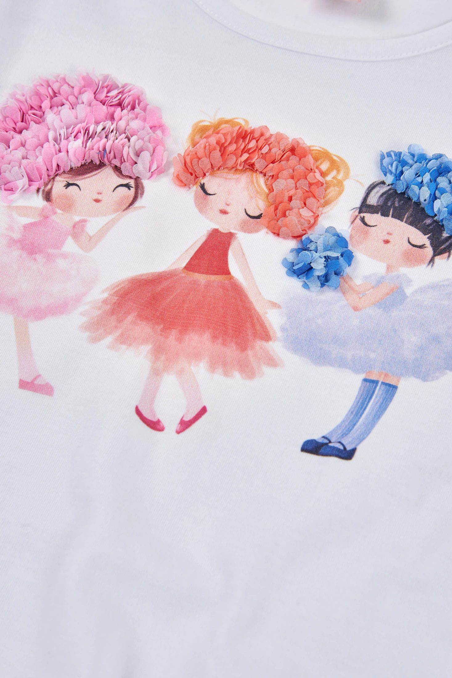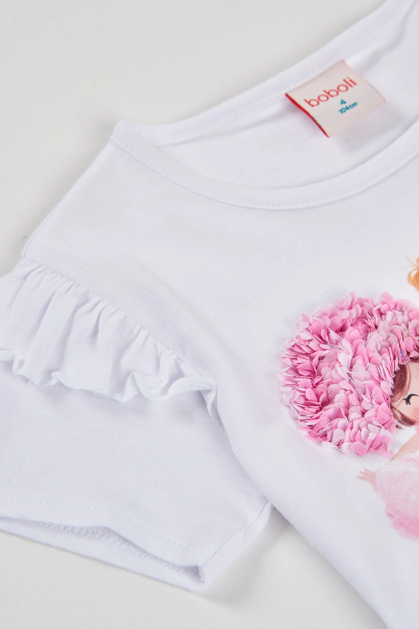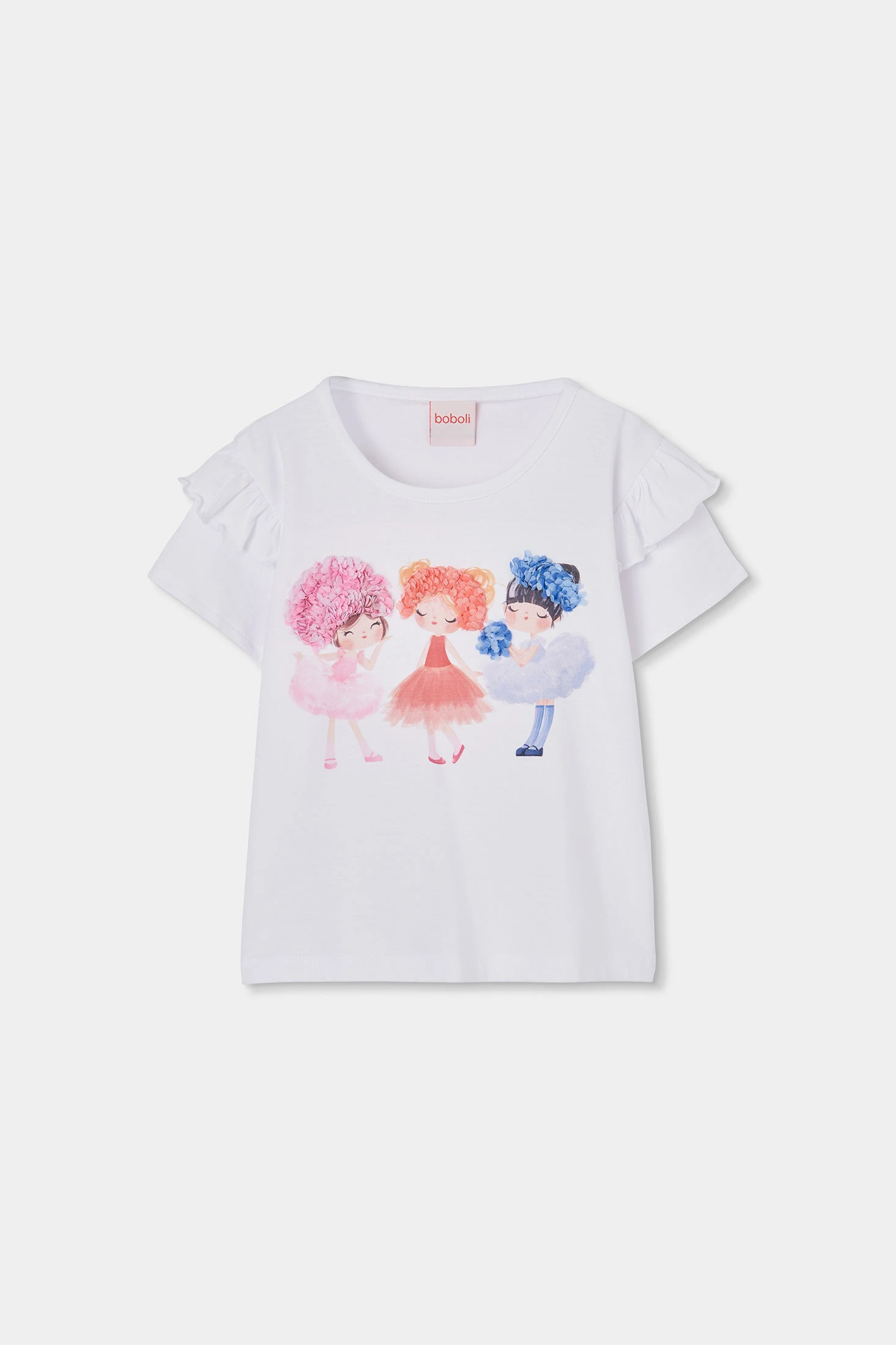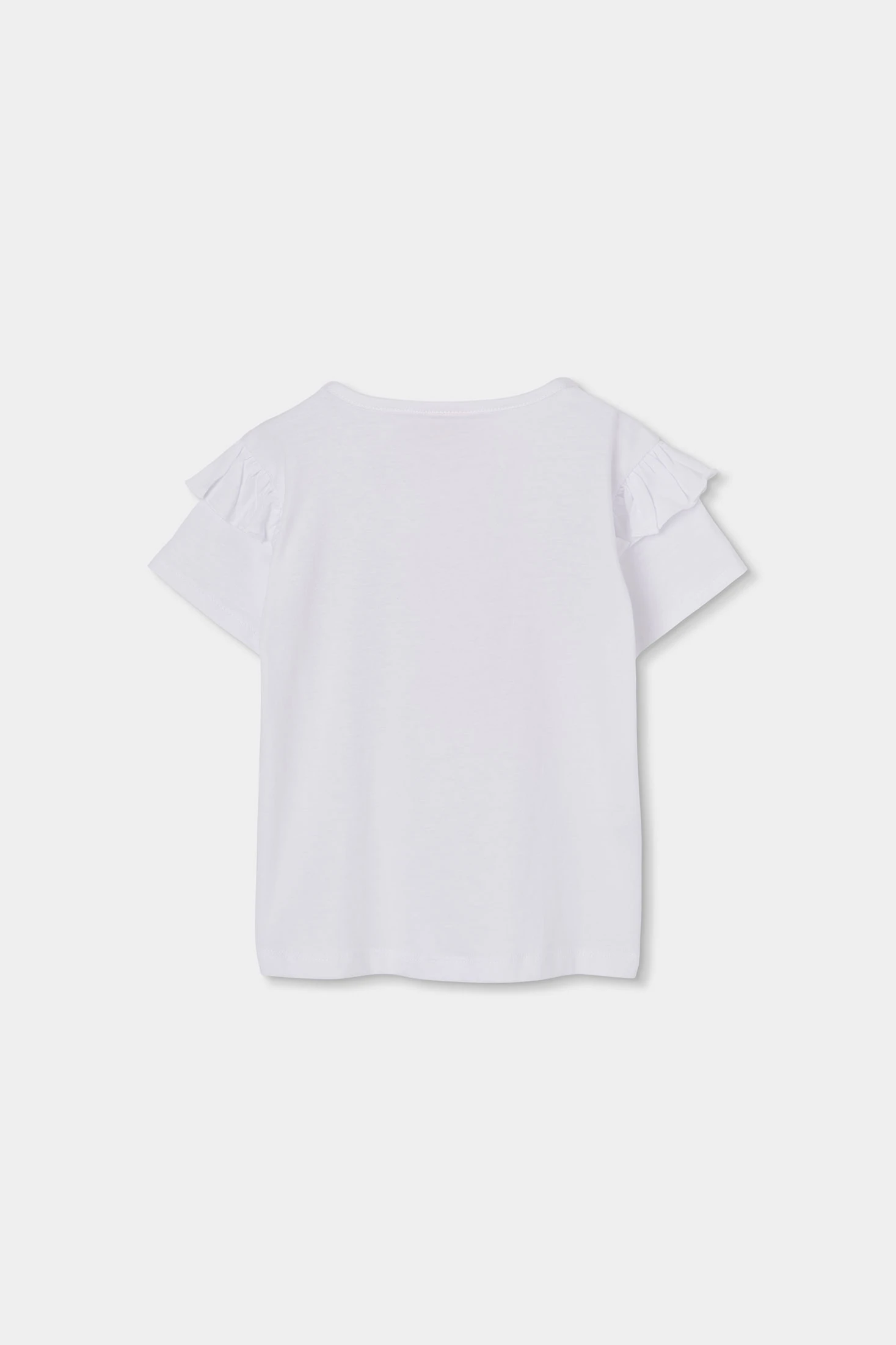 White cotton T-shirt for girls, ideal for everyday wear. Decorated with a colourful character print and floral texture embroidery, it features short ruffled sleeves that add a fun touch. Available in sizes from 12 months to 10 years, it is perfect for various ages. The soft and lightweight material ensures comfort, while the playful design makes it easy to pair with other garments for a fresh and chic look. Ideal for any casual or more formal occasion.