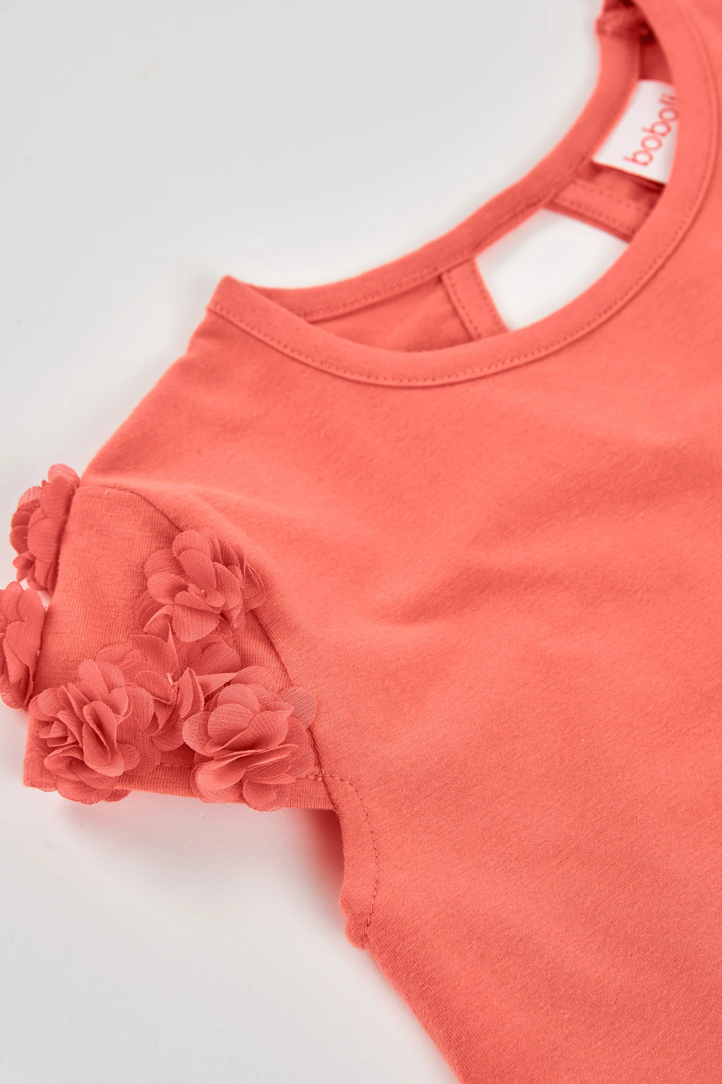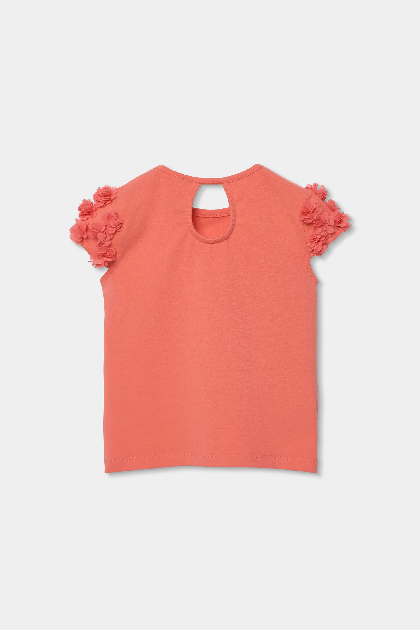 Cotton t-shirt for girls, ideal for any occasion. In a vibrant strawberry colour, it features a simple design with sleeves adorned with small hand-sewn fabric flowers. The straight cut of the t-shirt ensures comfort, while the cotton material guarantees softness and breathability. Available in sizes from 2 to 14 years, it adapts to little ones' growth. Perfect for pairing with shorts or skirts, this t-shirt is a versatile garment for the spring and summer season.