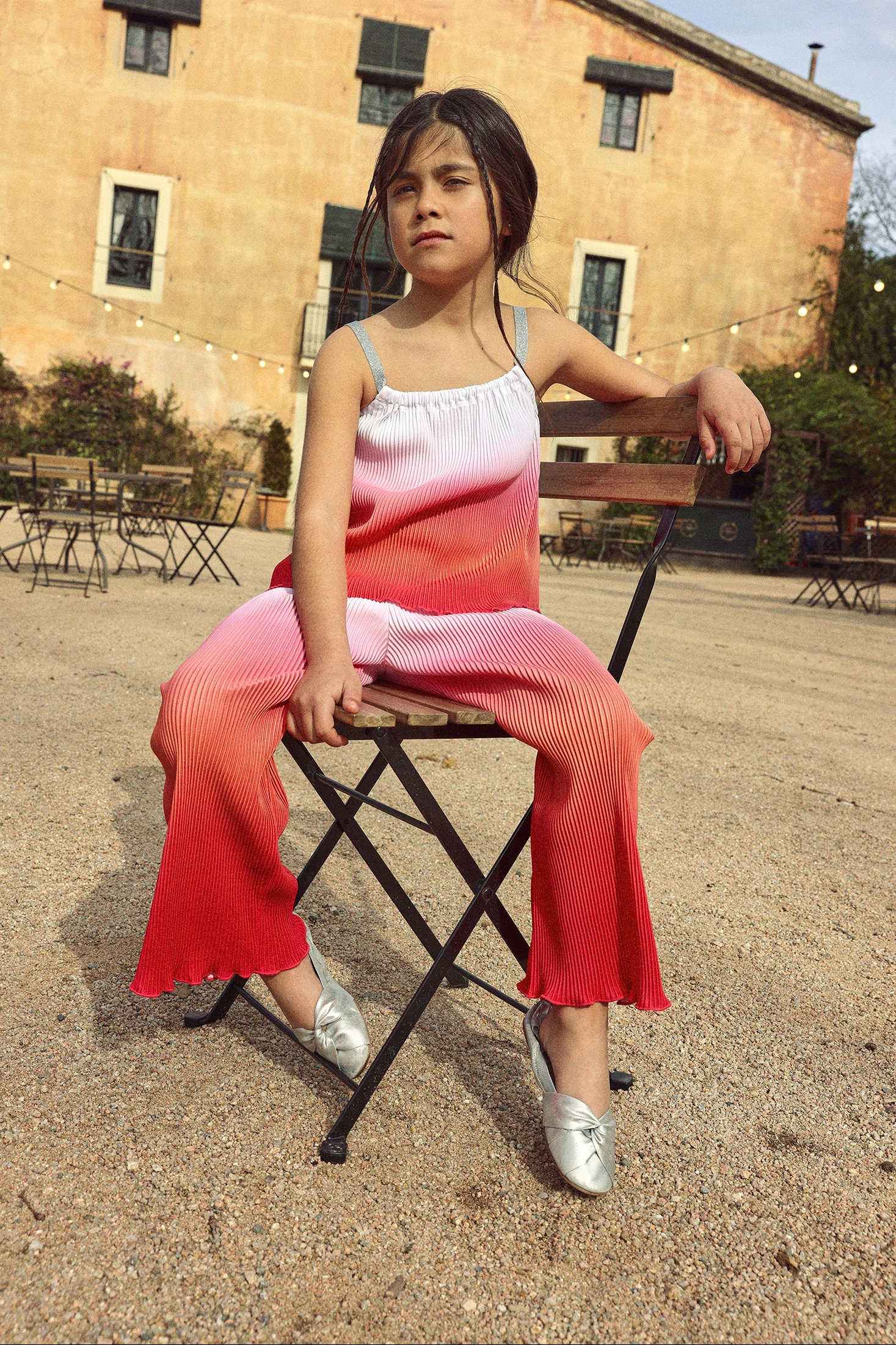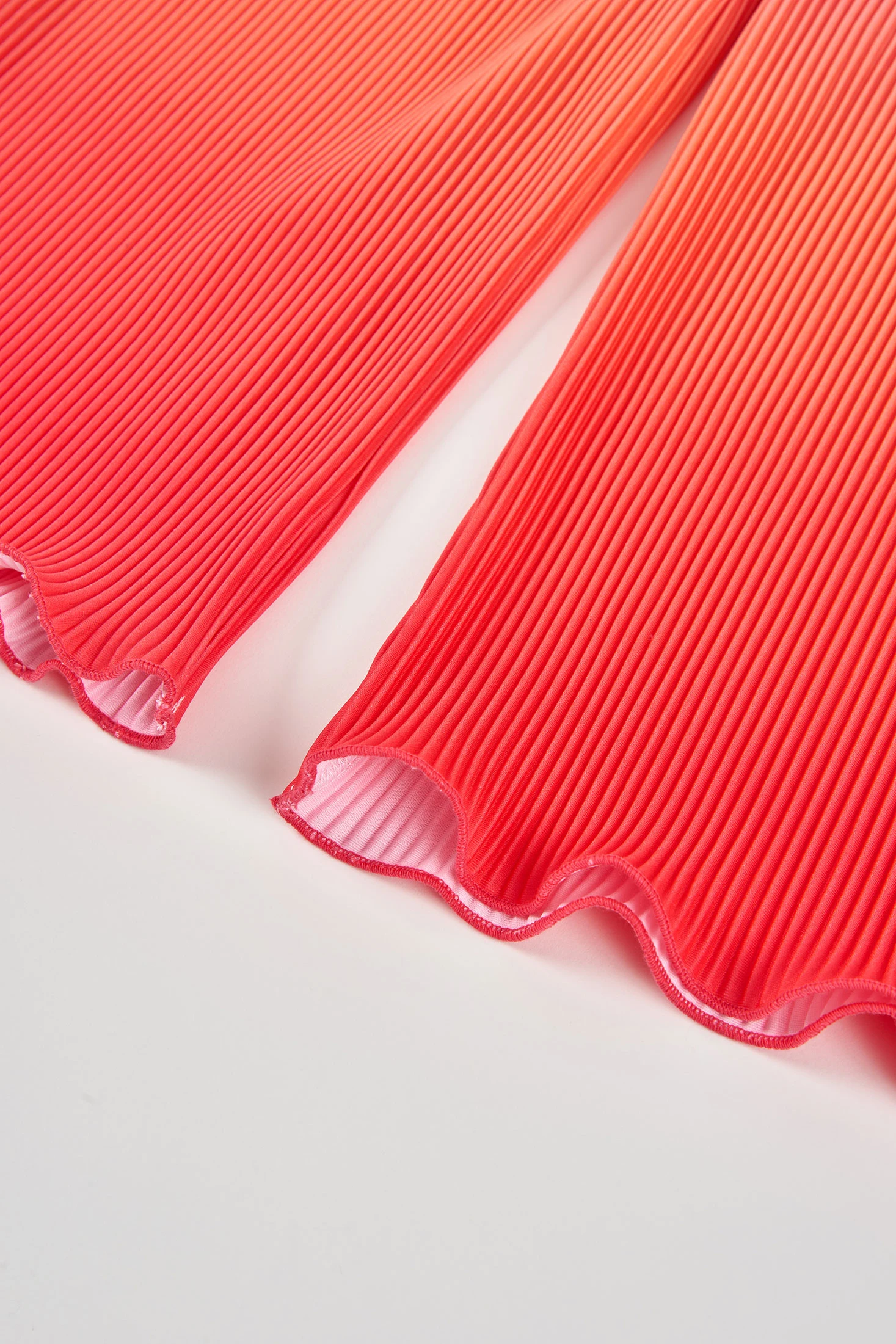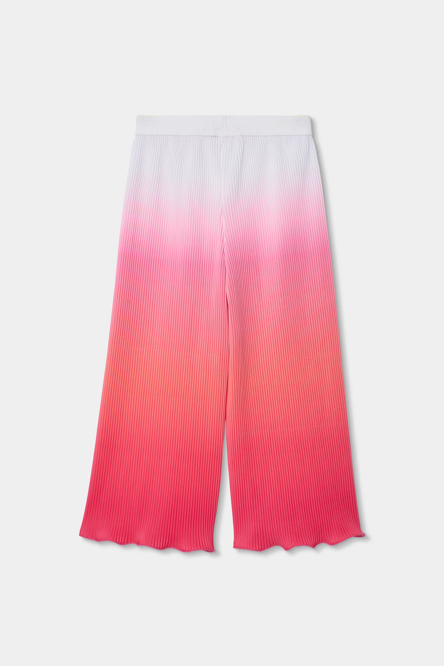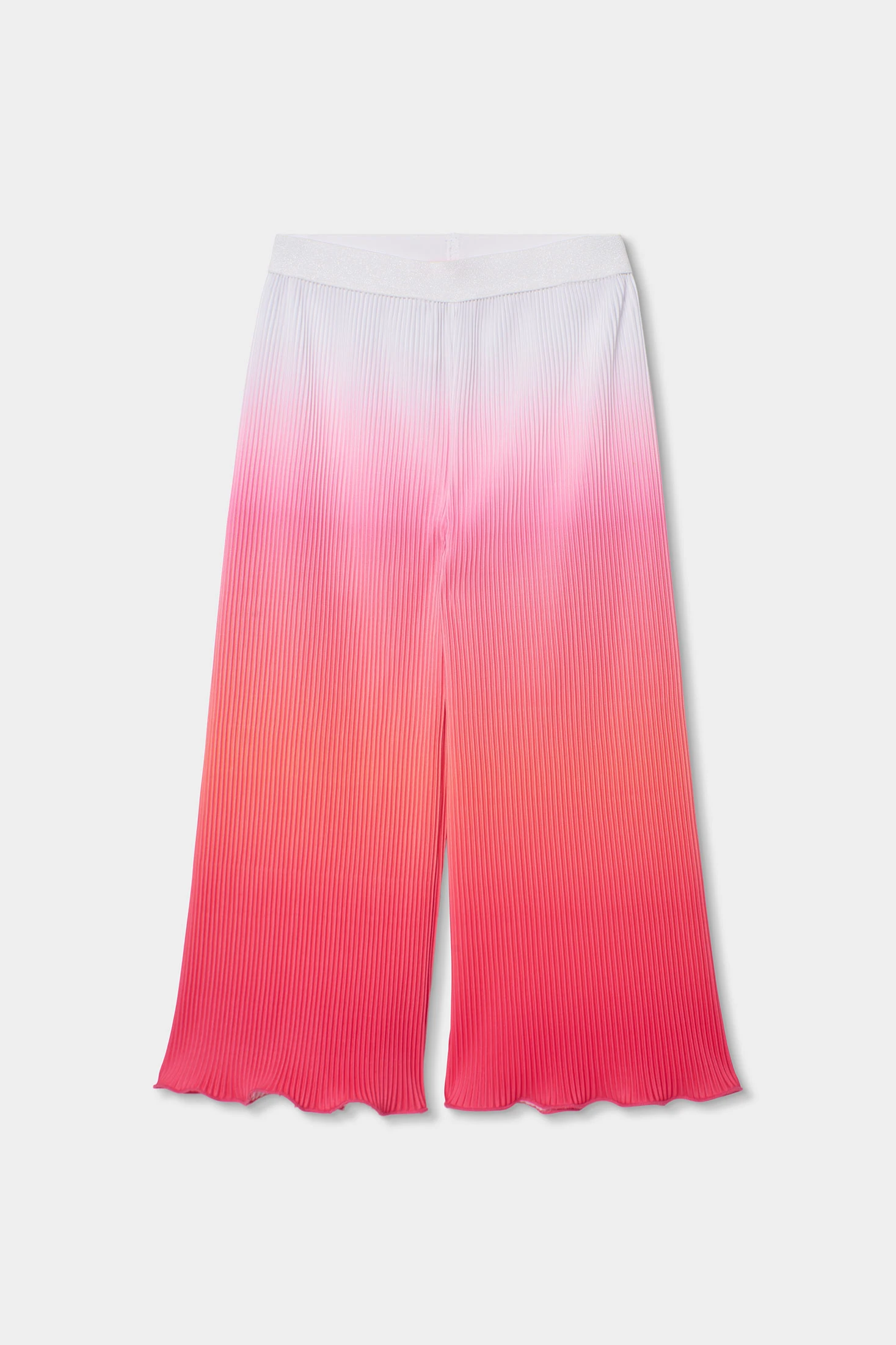 Girls? trousers perfect for adding colour and style to the wardrobe. Made from pleated material that ensures comfort and freshness, they are ideal for the spring and summer season. The strawberry to white gradient design is modern and attractive. Available sizes range from 2 to 14 years. A versatile garment that can be easily paired with simple T-shirts or blouses for a summery and fresh look. The elastic waistband ensures a comfortable fit for daily wear.