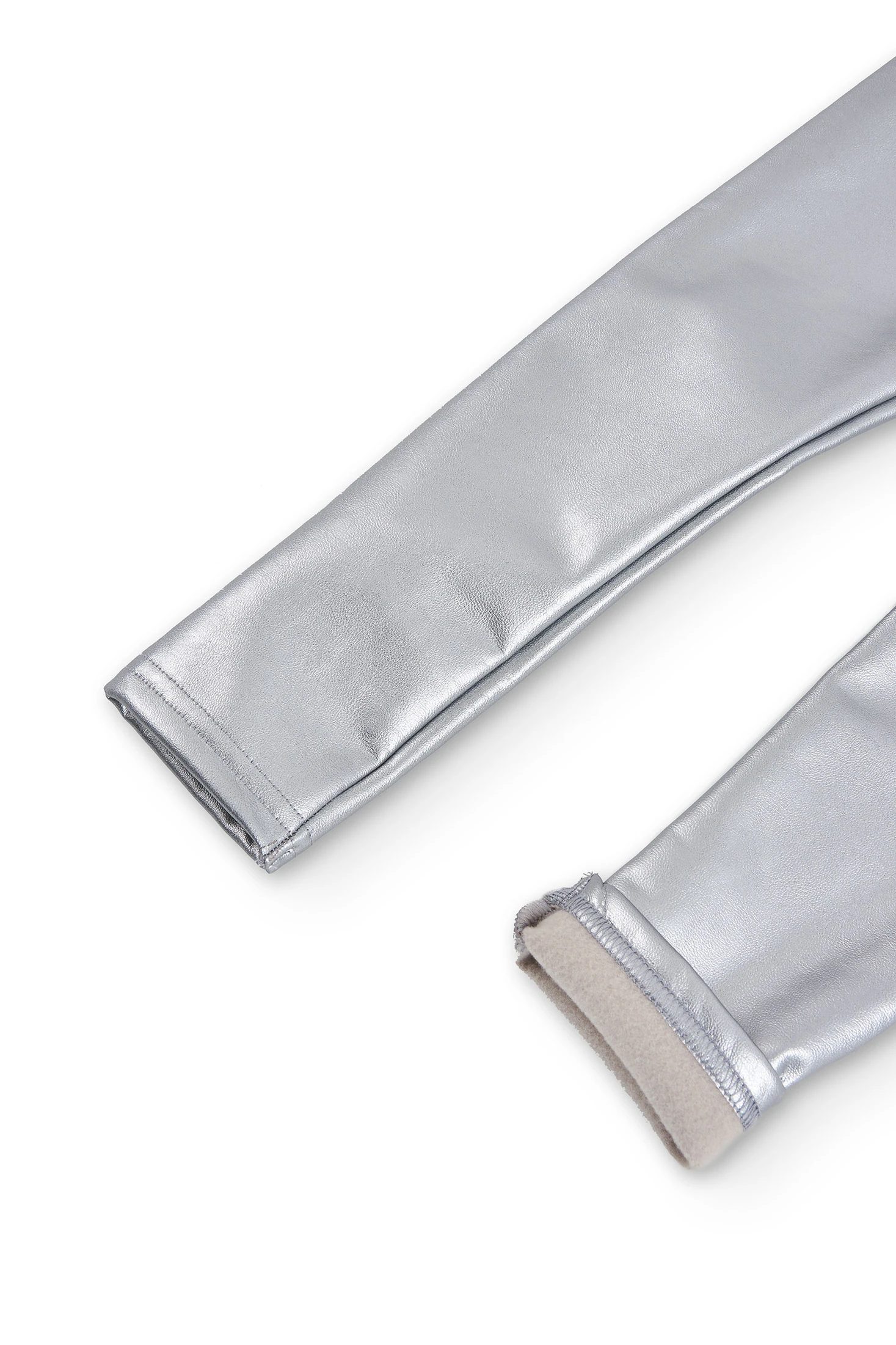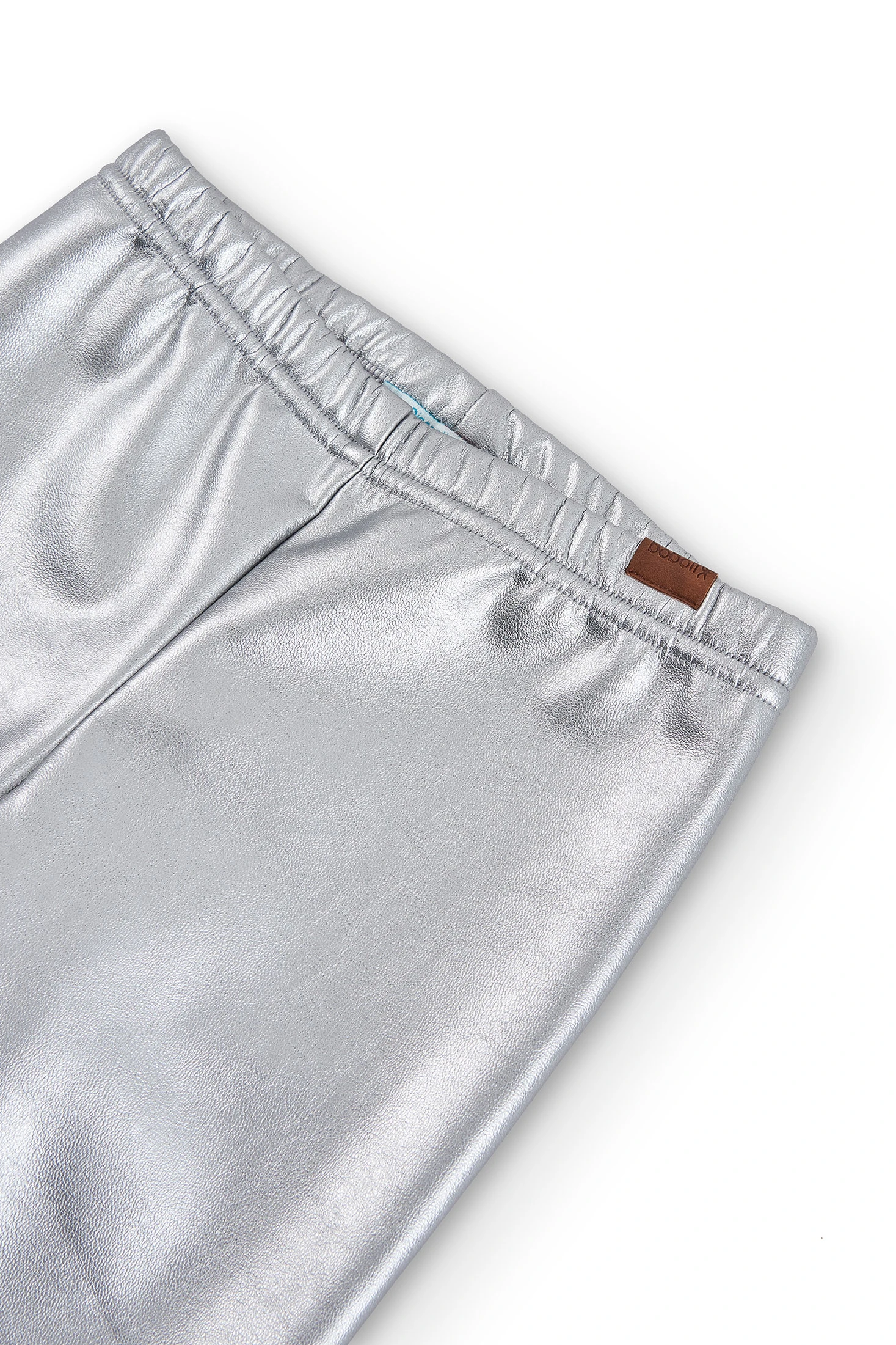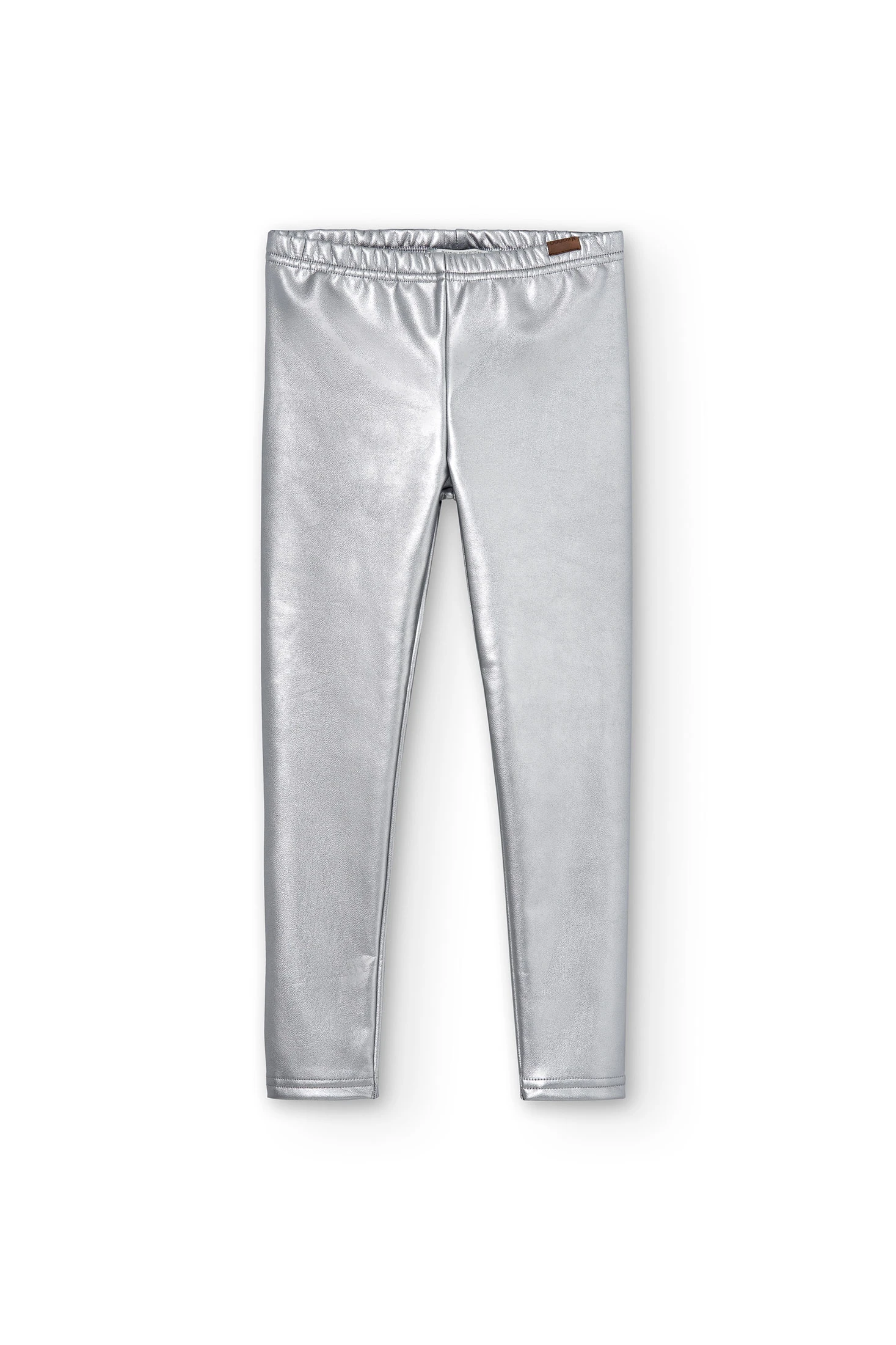 Girls' silver faux leather leggings with elastic. They feature a small print with brand detailing. Available from sizes 4 to 16 years.