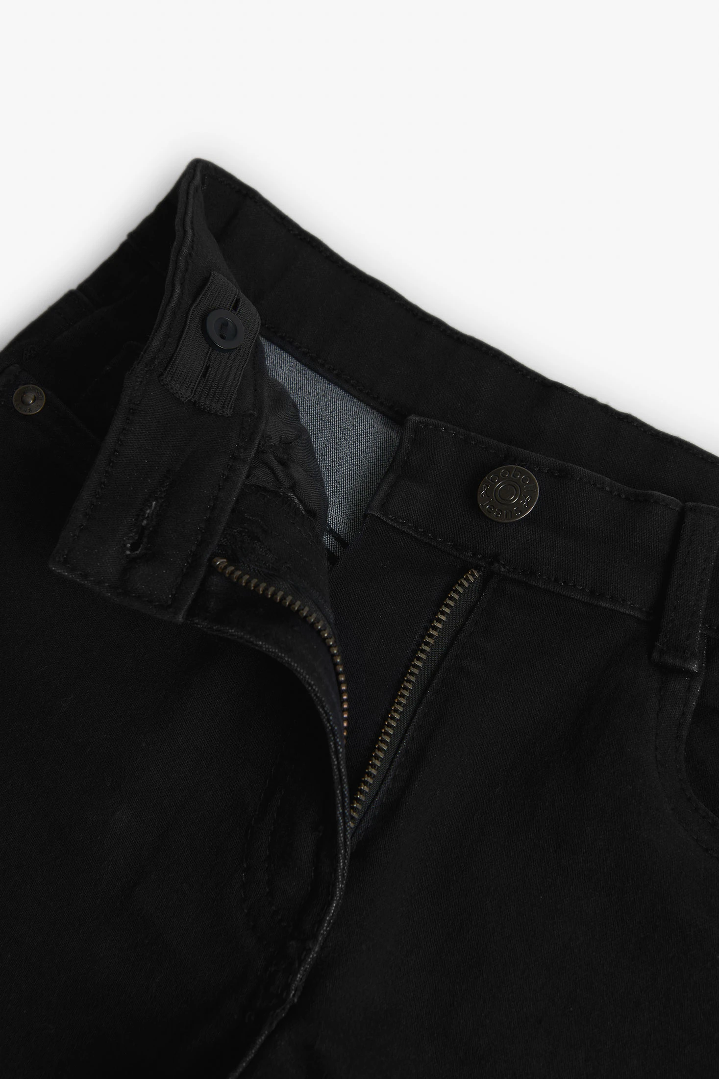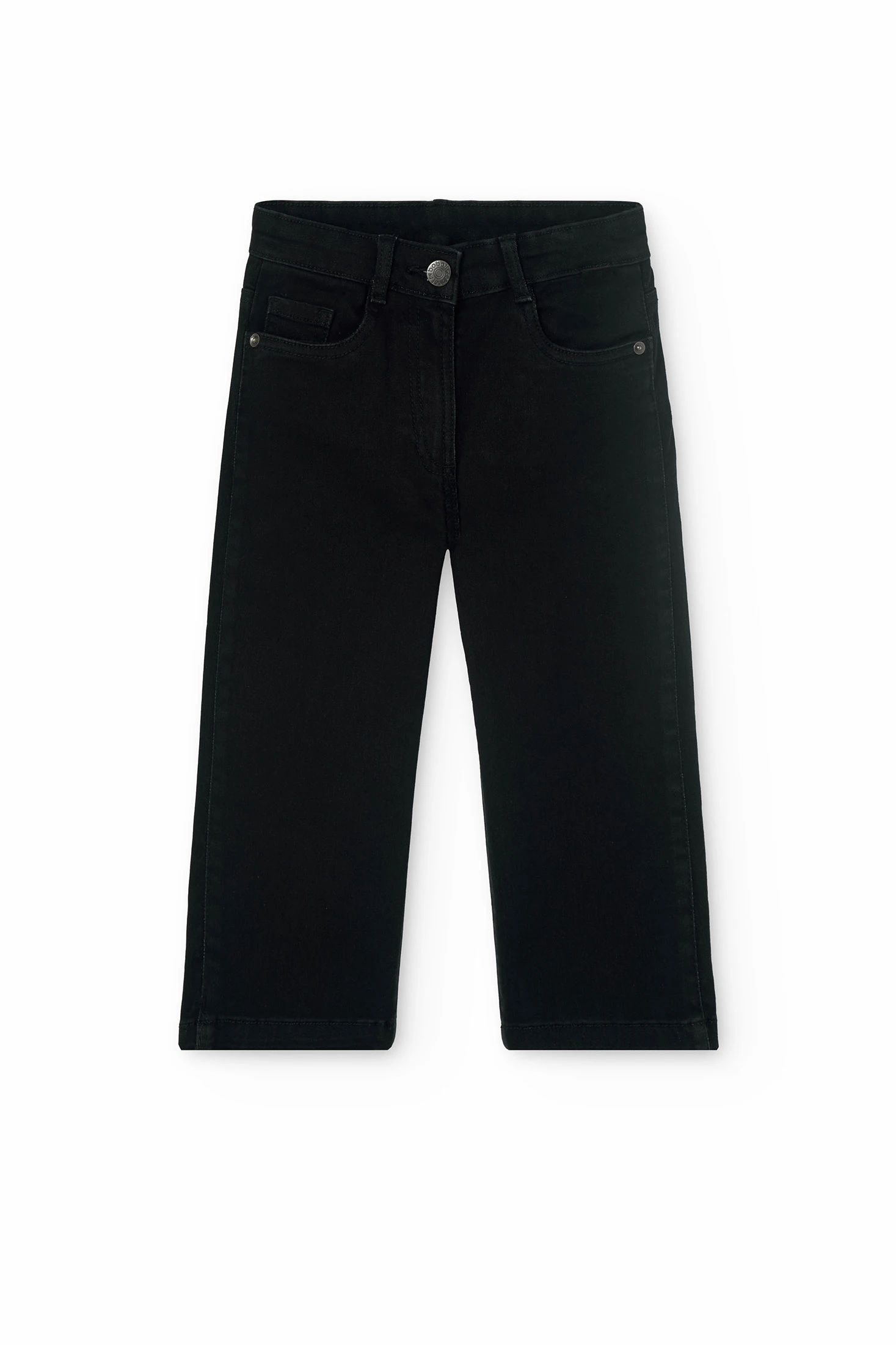 This is a plain, black, stretch denim trouser for girls. It's available in sizes ranging from 4 months to 16 years. The fabric is flat, making it comfortable for everyday wear. It's perfect for in-between seasons, ensuring your child stays stylish all year round. The trousers are easy to put on and take off, thanks to the button closure. This versatile piece can be paired with any top, making it a must-have in your child's wardrobe. Please note, this product does not include any brand names or promotions.