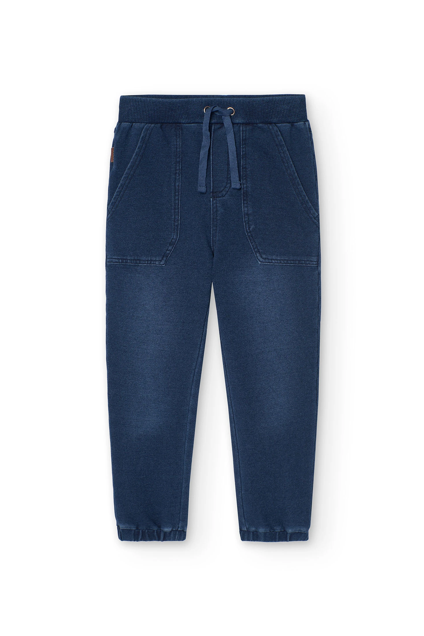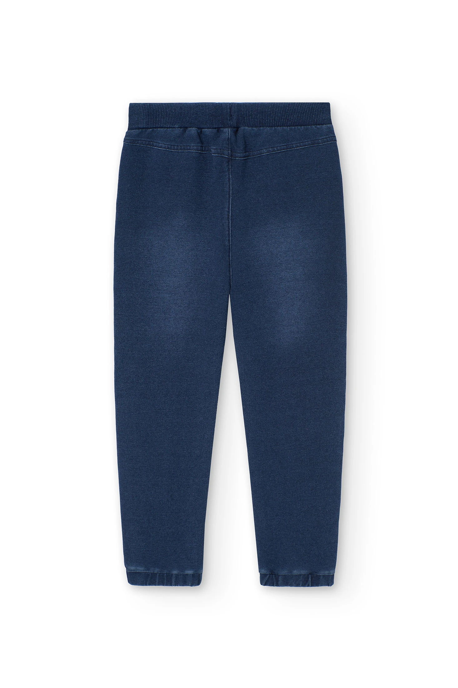 This is a denim fleece trouser for boys, available in sizes ranging from 4 months to 16 years. It's a plain design, made from knitted fabric, making it a perfect choice for in-between seasons. The trouser is in a striking shade of blue, adding a pop of colour to your child's wardrobe. It's a versatile piece that can be paired with various tops for different looks. The trouser is comfortable and durable, ensuring it can withstand the active lifestyle of children. It's a practical and stylish addition to any boy's clothing collection.