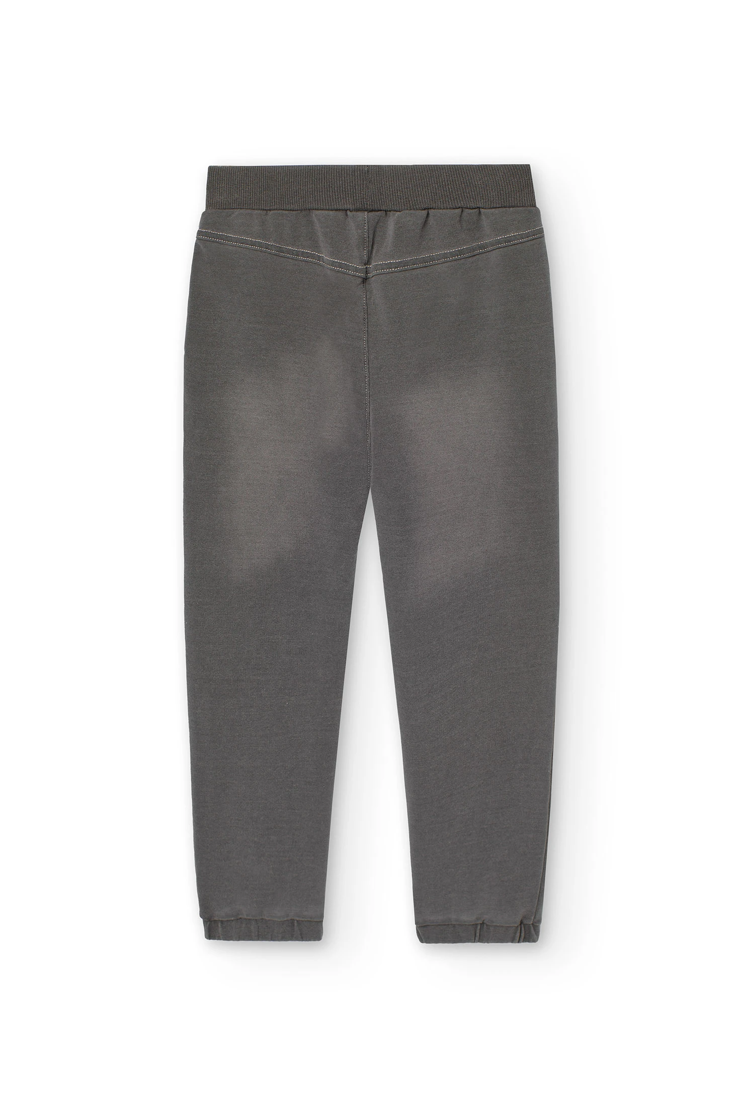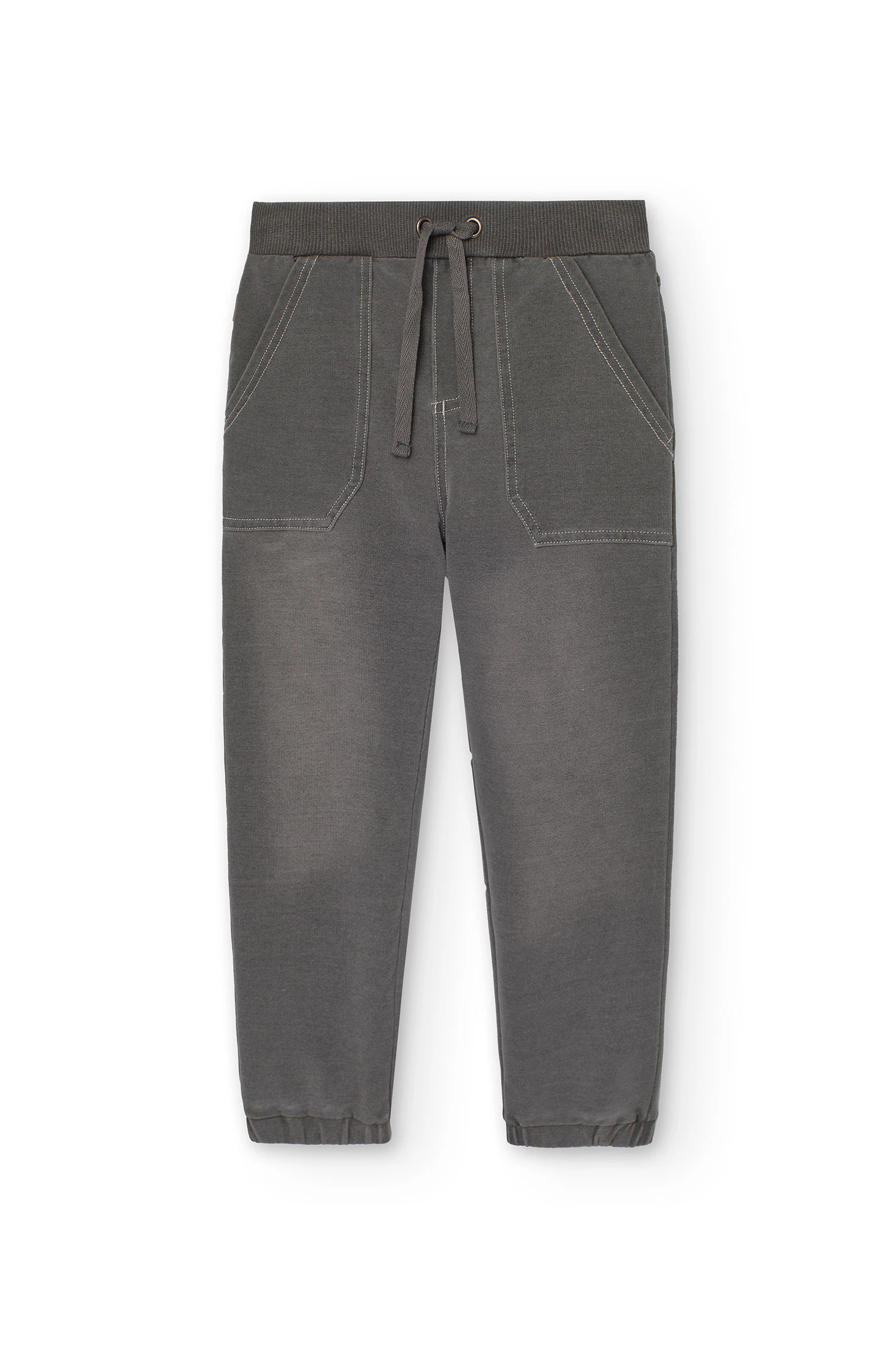 This is a plain, grey denim fleece trouser for boys. Available in sizes ranging from 4 months to 16 years, it's a versatile piece for any child's wardrobe. The fabric is knit, making it comfortable and easy to move in, perfect for active kids. It's a great choice for in-between seasons, providing just the right amount of warmth. The design is simple and unadorned, making it a practical and stylish option for everyday wear. This trouser is not only functional but also fashionable, a must-have for every young boy's clothing collection.